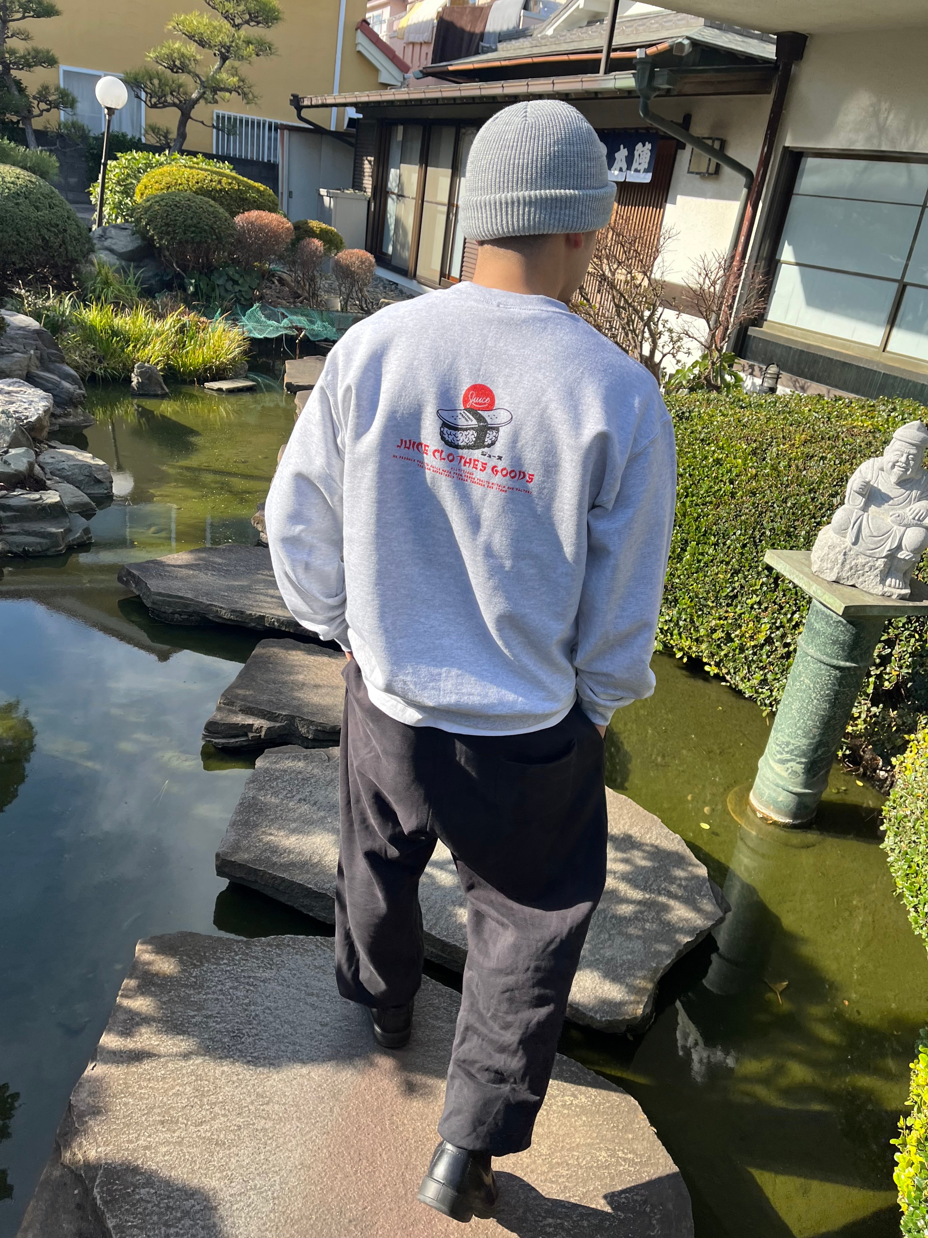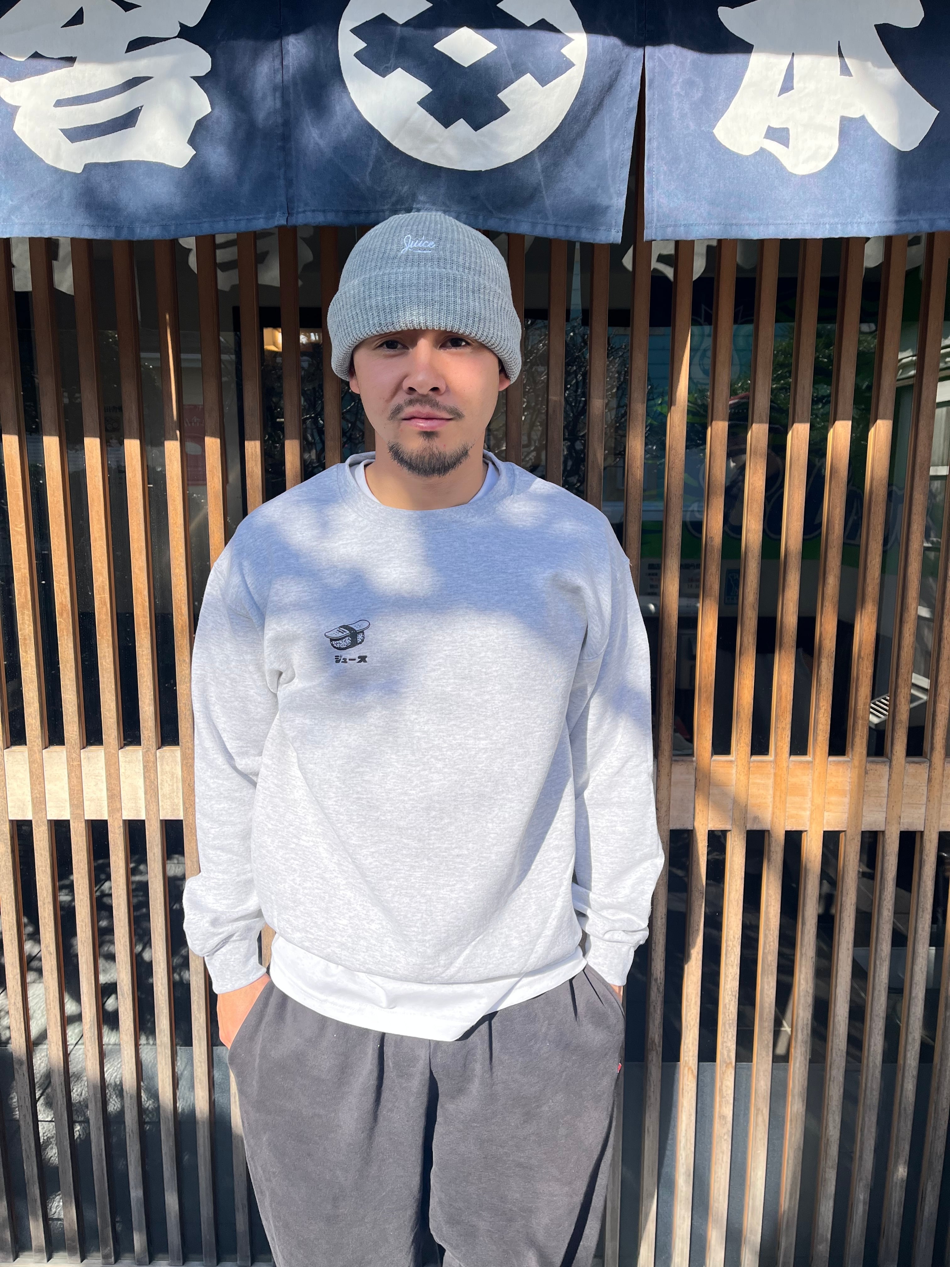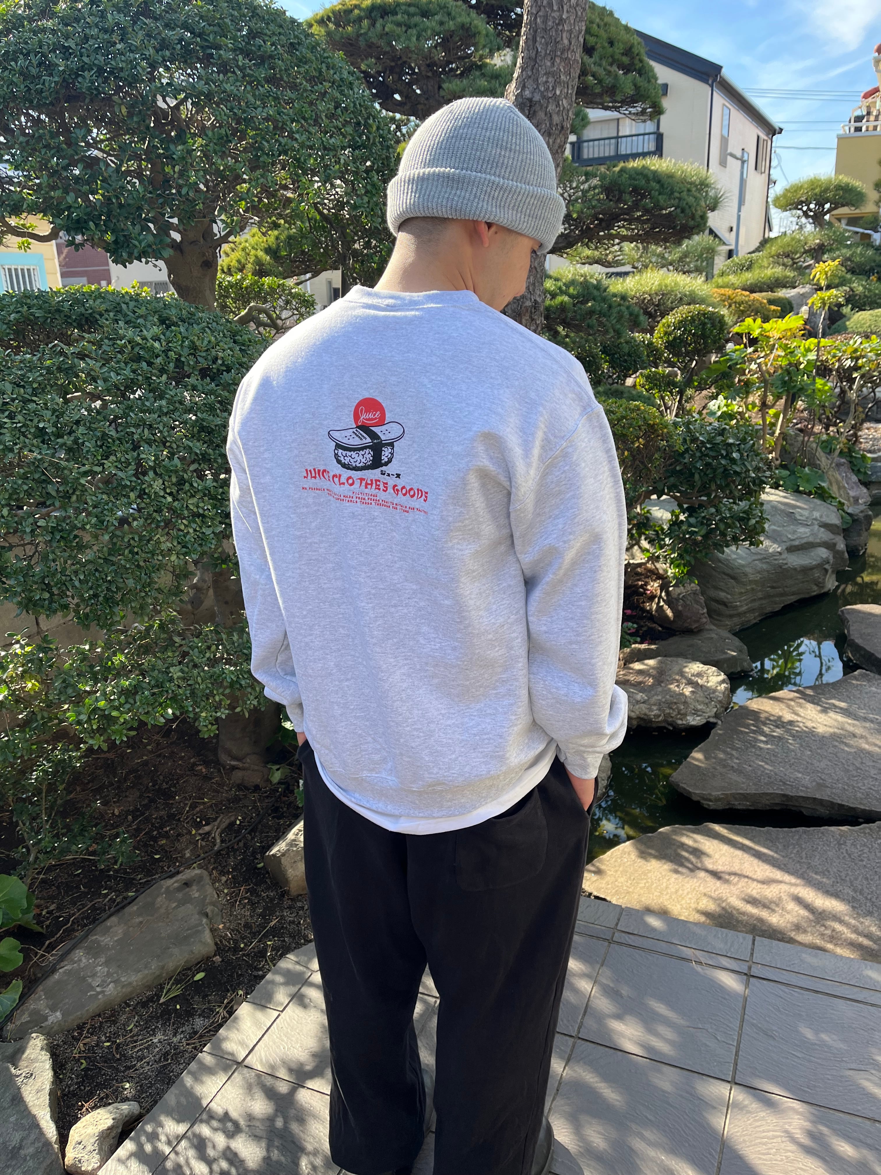 ゆったりとしたサイズのオーセンティックな裏起毛アメリカンスウェットにサビ抜きデッキ寿司のコントラストがGood!!
